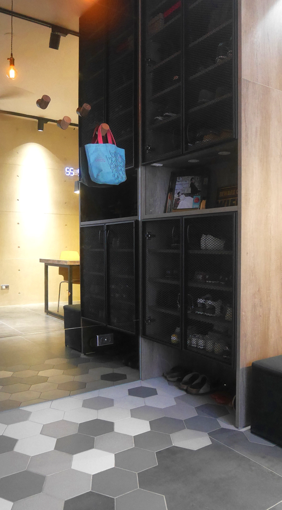 • 鞋櫃則使用鋁方管結構,加上金屬網作遮擋,既保留透氣性、也維持視覺簡潔;木紋側板則讓冷冽線條多了溫度,呈現意外和諧。